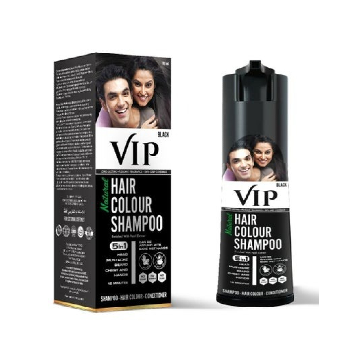 VIP Hair Colour Shampoo is a popular, 5-in-1 hair color product that acts as a shampoo, color, and conditioner, known for its easy application with bare hands in just 15 minutes, offering grey coverage without ammonia, gloves, or stains, enriched with natural ingredients like pearl extract for a salon-like color at home. It comes in shades like black and brown, providing a convenient alternative to traditional dyes for men and women.